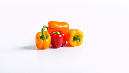Flat lay of colorful red and yellow bell peppers on a clean white surface. Ideal for recipe and vegetable-themed content