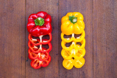 Sliced red and yellow bell peppers arranged in a pattern on a light surface, leaving space for text.