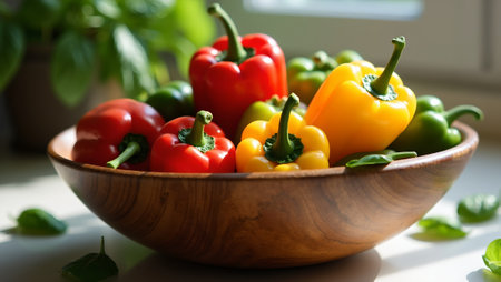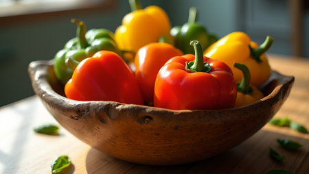 Fresh bell peppers in wooden bowl on kitchen counter with basil leaves sunlight