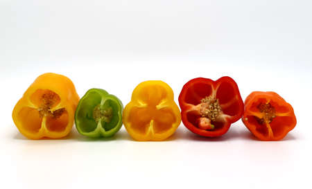 Composition of several halves of ripe sweet pepper of different colors on a light background. Natural product. Natural color. Close-up.