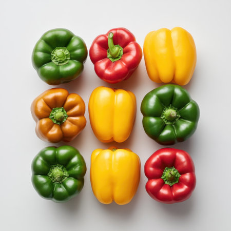 A vibrant selection of bell peppers in green, red, yellow, and orange arranged neatly on a white background. Ideal for culinary art and fresh food themes.