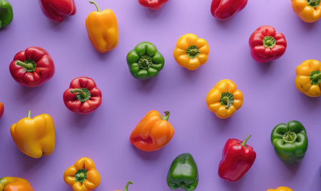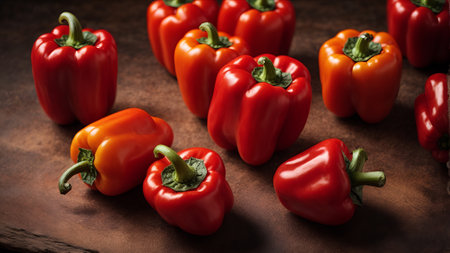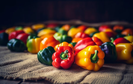 Abstract background of sweet peppers laid out on surface. AI generated.
