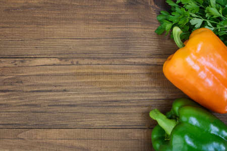 Green and yellow bell peppers, with parsley, on a wooden table background. Top view, border, frame, flat lay. Copy space