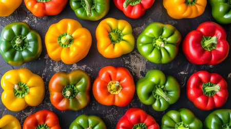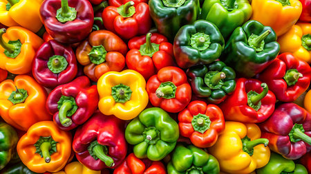 Colorful bell peppers background fresh green, red, and yellow vegetables backdrop