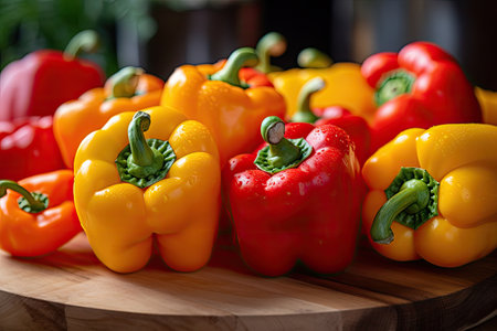 Shiny Bell peppers colorful closeup. Color food. Generate Ai