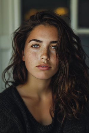 A young woman with dark, wavy hair and striking blue eyes gazes thoughtfully into the distance, her expression serene. She is wearing a warm, rust-colored sweater, and the soft, natural light suggests a moment of quiet contemplation by a window.