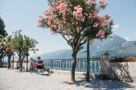 Back view of young woman relaxing on scenic quay of mountain Lake Como in Italy.