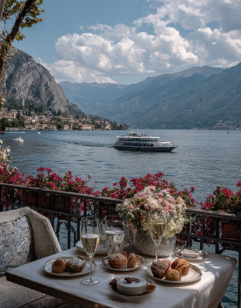 A table is set with food and drinks in front of a scenic lake, featuring a boat and mountains in the background. The scene is bathed in natural light, with soft textures and vibrant floral accents. This image is suitable for use in travel, lifestyle, or commercial projects.
