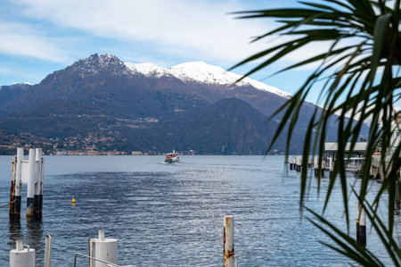 Bellagio Province of ComoItaly January 19 2019 Ferry boat midway to Bellagio on the Lake Como at Winter cloudy day Pier on lake with ferry boat empty dock : Generative AI