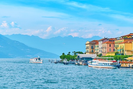 Menaggio, Lombardy, Italy - MAY 11, 2019: View of the famous Menaggio town and the ship on Como Lake, in the Alps before the storm, in inclement weather.