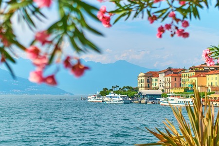 Beautiful sunny summer view of Bellagio town at lake Como in Italy with blooming nerium oleander flowers, ships and boats