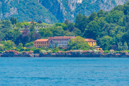 Shoreline of Lenno Commune on Como Lake. Lombardy. Italy. Panorama with Mountains and Forest.