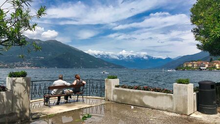 Bellagio, Italy - July 06, 2017: Man relaxing on a bench in Bellagio, overlooking Lake Como. Bellagio is often referred to as the “Pearl of the Lakeâ€.