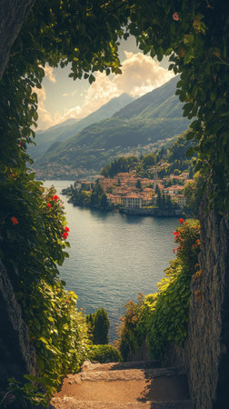 The tranquil waters of Lake Como reflect the lush green hills and picturesque villages nestled along its banks, framed by the stunning Alpine backdrop.
