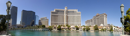 Panoramic view of the Bellagio Casino and Hotel and Caesars Palace Casino on the right and the Cosmopolitan Casino on the left in Las Vegas, Nevada . 7 pictures were used to make this large panoramic Image