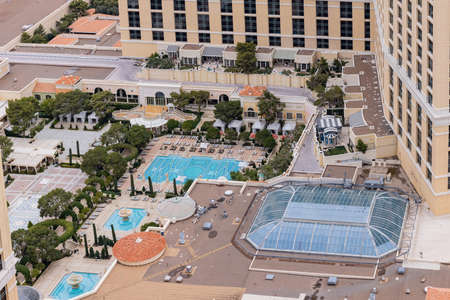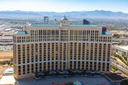 LAS VEGAS, USA - MARCH 29, 2020: Panoramic aerial view of Bellagio Hotel and Casino in Las Vegas, Nevada, USA