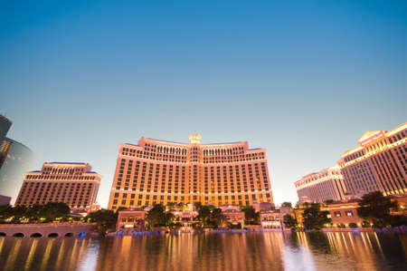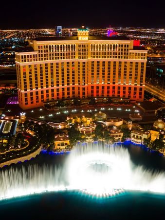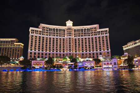 Bellagio hotel and casino at night in Las Vegas Strip in Las Vegas, USA. The Strip is home to the largest hotels and casinos in the world.