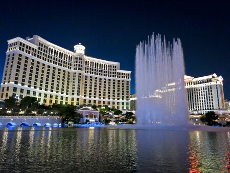 Fountains of Bellagio hotel with bright lights of hotels on Las Vegas Strip in Paradise, Nevada. Las Vegas, USA - September 28, 2018.