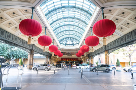 magnificent hotel with a large central entrance decorated with Chinese lanterns and a driveway for cars in Las Vegas.