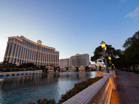 Las Vegas, Jan 11: Afternoon sunny street view of the famous Bellagio Hotel and Casino with the fountain and water dance on JAN 11, 2020 at Las Vegas, Nevada
