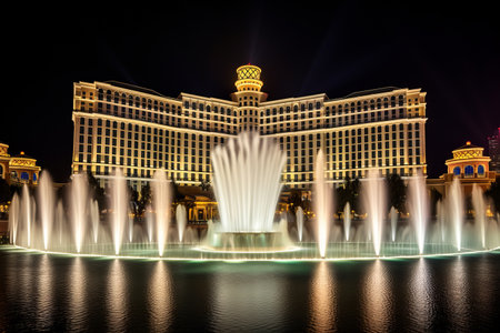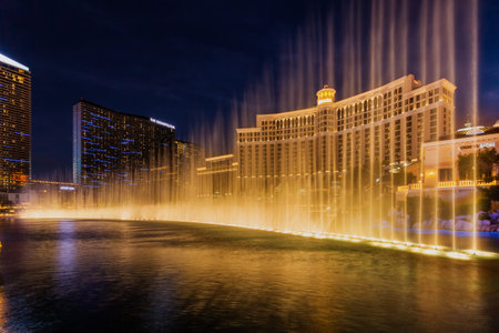 LAS VEGAS, USA - MARCH 29, 2020: Fountains of Bellagio at Bellagio Hotel and Casino at night in Las Vegas, Nevada, USA