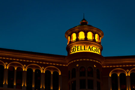 Las Vegas, NV, USA - April, 2017: Bellagio is a luxury hotel and casino located on the famous Las Vegas Strip. Bellagio Central Tower Casino Hotel close-up at night. Name signboard casino closeup.