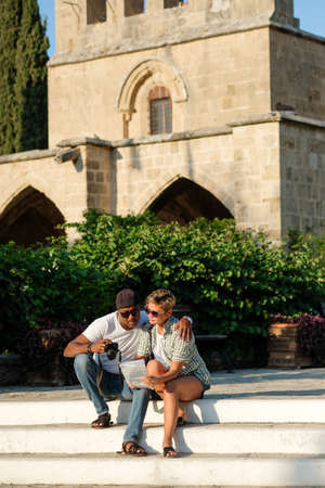 Happy Moments. Cheerful dark skin couple Taking shoot On camera While Having Romantic Date travel, middle age African American Spouses in trip. Woman points the finger Mixed race couple, copy space