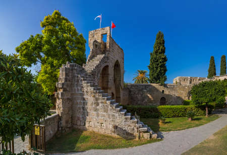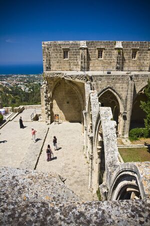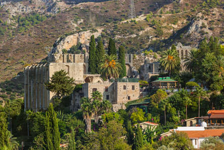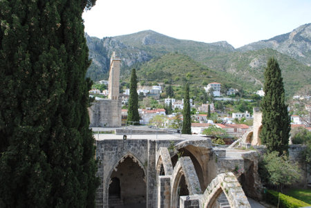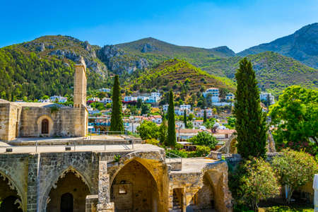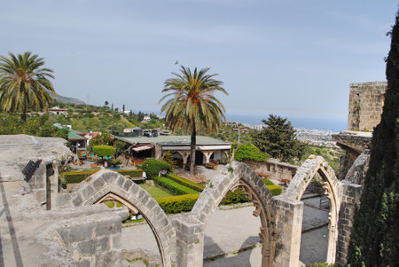 Beautiful Bellapais Abbey Monastery with distance city view. Kyrenia, Girne Northern Cyprus. High quality photo