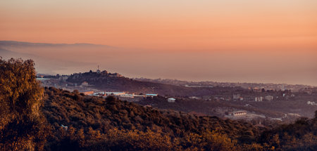 Beautiful Mountains Landscape in Mild Pink Sunset Light. Picturesque Panoramic View. Amazing Nature of Lebanon.