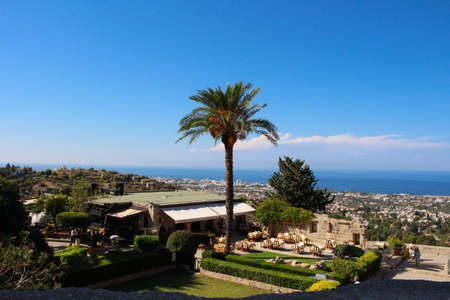 Top view of Bellapais Abbey, open restaurant, Kyrenia, sea and bright blue sky. White Abbey, the Abbey of the Beautiful world. Kyrenia. Cyprus.