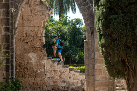 BELLEPAIS ABBEY, CYPRUS - June 17, 2020: Visitor climbing up the stairs to enter the monastery.