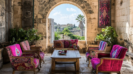 This inviting living space features vibrant furniture and a scenic view, creating a cozy atmosphere filled with natural light and aesthetic charm.