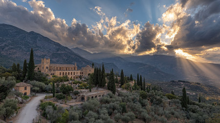 An aerial view showcases a stone building nestled on a lush, green hillside. The structure appears old, with multiple sections and a tower. The scene is illuminated by dramatic sunlight breaking through a cloud-filled sky. Suitable for travel, tourism, or architectural projects.