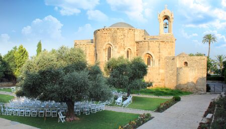 Beautiful exterior of an old ancient church, place of worship, house of god, majestic building over sky background, Lebanon