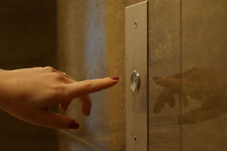 Woman about to push the elevator button. finger presses the elevator button. businessman elevator. hand reaches for the button of the elevator call.