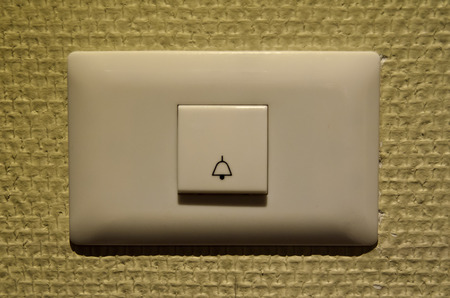 Close up on a filthy old electric doorbell fitting on a wooden door with bell icon on the button. This is a lighter version, a darker version is also available in the portfolio
