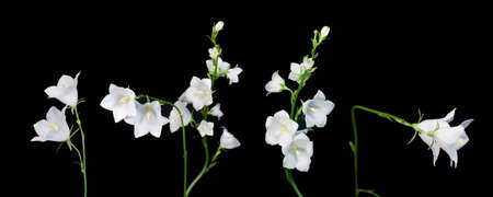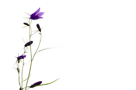 close-up of Campanula or bellflower on white background with copy space. floral macro. spring and summer border template . greeting and holiday card or postcard