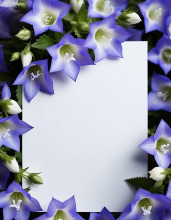 Blank piece of paper surrounded by frame of purple or blue bellflowers. Flowers arranged around paper, creating natural beautiful border. Background or template for a variety of purposes, copy space