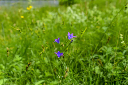 Harebell, Campanula rotundifolia, wildflower growing among green grass in Siberian forest. Summer