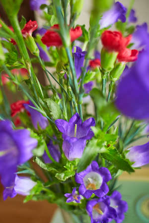 Bouquet of Canterbury bells purple flower blooming (Campanula medium) and red small carnations. Unpretentious and delicate violet bells in the garden.