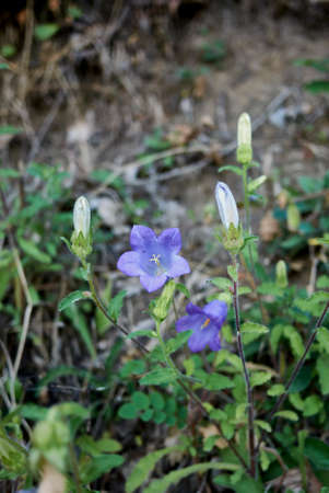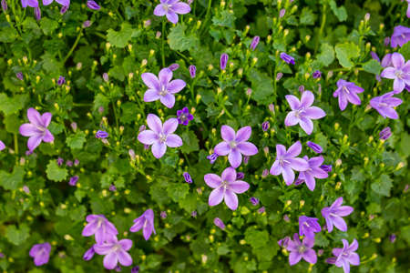 Violet lilac Bellflower blooming in forest. Campanula bononiensis