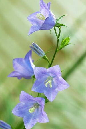 One stem with beautiful blue-lilac spreading bellflower flowers on blurred green grass background. Meadow spring-summer blooming plants. Background with copy space