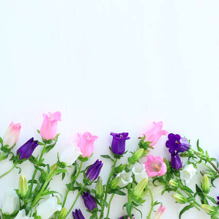 spring bouquet of purple, white and pink bell flowers over white wooden background. top view, flat lay