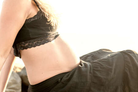 Close up of pregnant belly. Pregnant woman in black dressed. Background blue sea.