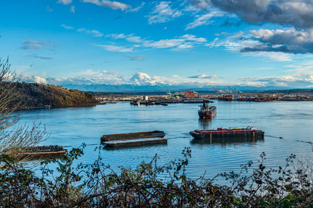 Mount Rainier towers over the Port of Tacoma in Washington State.