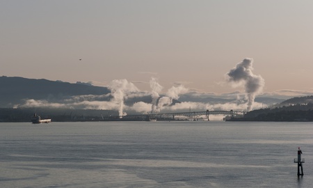 Industrial Processing Plant and Container Ship passing by on a cloudy day. Nanaimo, Vancouver Island, British Columbia, Canada.