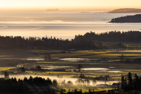 Aerial view of a residential neighborhood covered in a layer of fog during a vibrant sunrise. Taken in Greater Vancouver, BC, Canada.