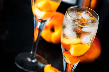 Peach Bellini alcoholic cocktail drink with prosecco, cava, or sparkling wine with peach puree, syrup and ice, dark bar counter background, copy space
