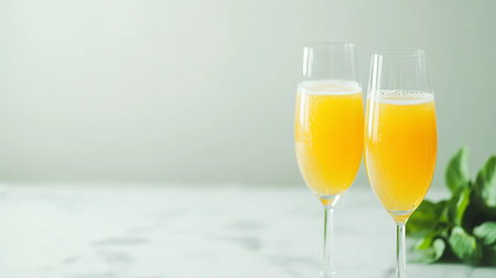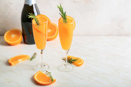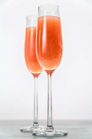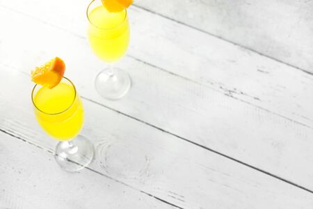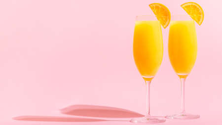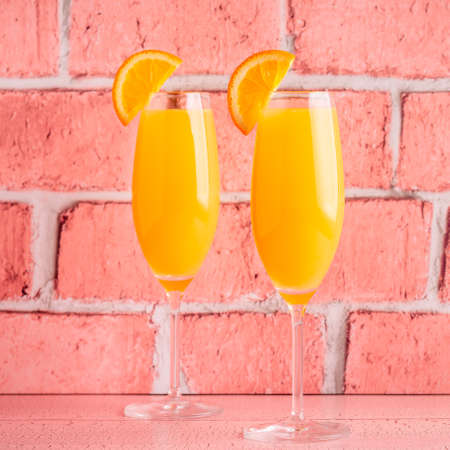 Refreshing orange Mimosa cocktails with champagne on a bright background.