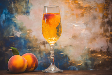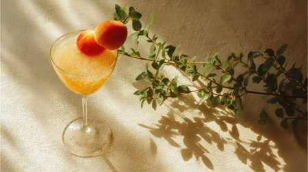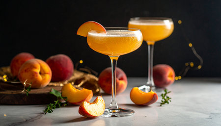 A beautifully crafted cocktail with fresh peach garnishes, set against a softly lit background, capturing a serene moment of indulgence and style.